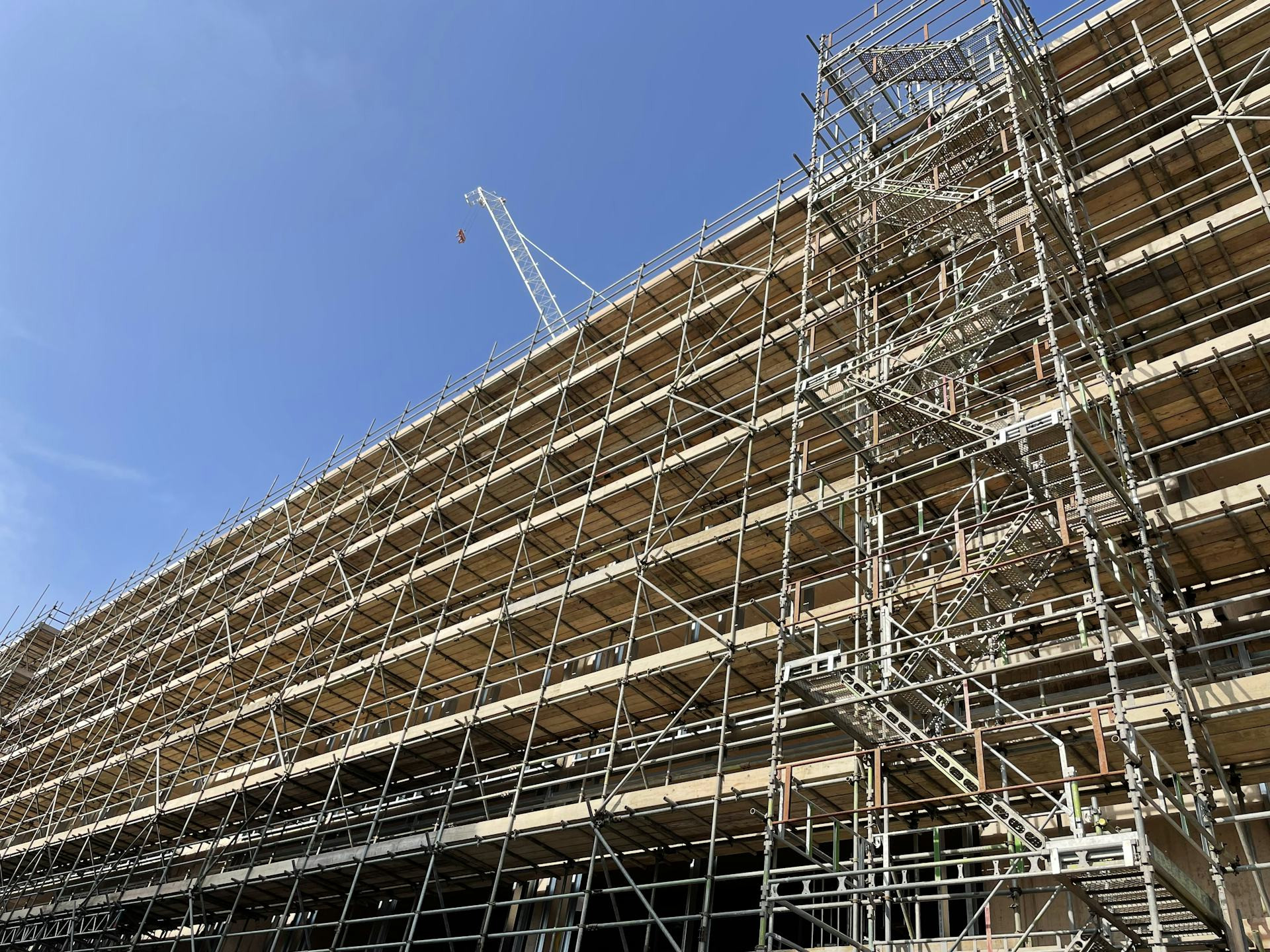 Når basen er stabil, kan du begynde at bygge opad. Tilføj dæk og diagonaler for at sikre stivhed. Arbejd systematisk i sektioner, så stilladset hele tiden står stabilt, mens du bygger videre.